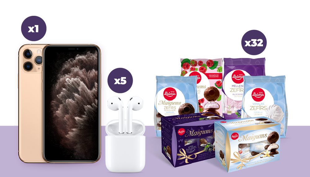 Balvu fonds sastāv no 38 balvām: 1 mobilā telefona Apple iPhone 11 Pro 256GB Gold, 5 mobilā telefona austiņām Apple AirPods MV7N2 un 32 “Laima” produktu komplektiem.